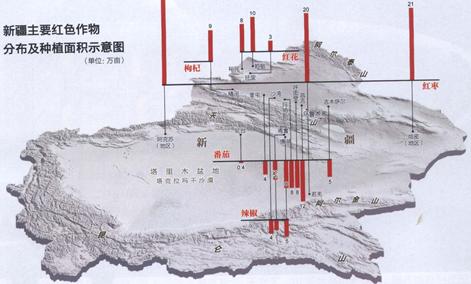 材料三:近年来,新疆“红色产业”发展红红火火蓬蓬勃勃,“红色产业”是该地区红色农产品及其加工产业的统称,红花、番茄、枸杞是该地区“红色产业”的三大支柱,其中番茄酱是重要出口创汇产品。下图为新疆主要红色作物分布及种植面积示意图。