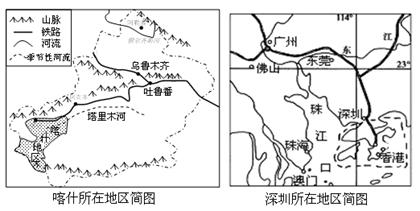 (2)材料二中喀什、深圳分别位于我国三大自然区中的?区、