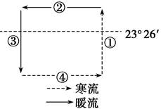 【小题1】图示为逆时针的洋流环流模式,回归线穿过,应为南半球的中低纬洋流模式图①为寒流,②为南赤道暖流,③为暖流,④为西风漂流。选B正确。