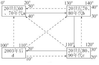 3、单选题 读某产业在不同年代的区域分布图(实线表示产业转移方向,虚线表示产品输出方向),完成题。