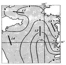 1、单选题 读某海域2月表层海水等温线图,完成(1)——(3)题。