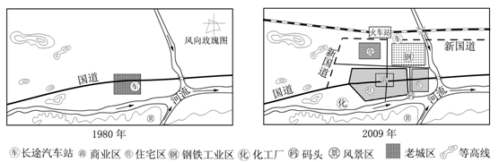 (1)比较两图,可以看到,城市用地规模扩大,住宅区面积扩大,说明城市人口不断增加,出现明显的功能分区。是城市化进程中的表现。