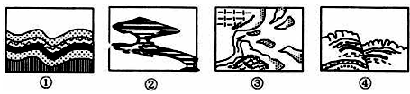 读图,图①是褶皱构造,内力作用形成。图②是干旱区风力侵蚀形成,属外力作用。③是流水沉积形成,属于外力作用。④是断层,是内力作用形成。所以A对。