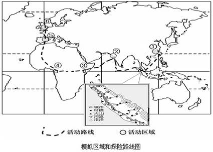 1、综合题 某校“地理社团”在2012年暑期用一周时间进行了网上模拟探究活动、研究了该时间内出现的一些地理现象,下图表示模拟探究的区域和探险路线。(8分)