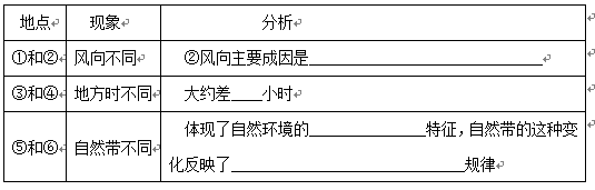 (1)社团成员们发现,有许多地点经度或纬度相近,但自然现象却差异明显,请结合所学地理知识,按要求补充下表中内容。(8分)