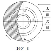 本题解析:本题考查晨昏线图的综合分析。(1)图示晨昏线与极圈相切,南极圈内出现极昼,故判断为北半球的冬至日,故日期为12月22日。此时过后的几天中,地球公转逐渐接近近日点,故公转速度逐渐加快。(2)图示A点为昏线与赤道的交点,故地方时为18时,则计算北京时间较A点时间晚2小时40分。(3)图示BC两地所在纬度相同,故自转角速度、线速度都相同,地转偏向力的方向相同;昼长相同;正午太阳高度相同。(4)图示自转方向呈顺时针,故B点位于南半球,而根据A点的经度为160°E,则计算B点所在经线为70°E。图示B点的时间为正午12时,故B点的太阳高度即为当地的正午太阳高度,利于正午太阳高度=90°-纬度差计算。(5)根据B点的经纬度位置判断其地理位置。