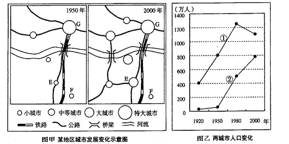 (1)甲图中1950年至2000年,该地区城市发展变化的特征直接表现_________、____________。一般说来,城市化水平不断提高的最重要标志是_________。