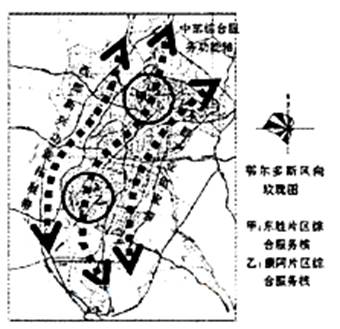 小题1:读材料,“一城双核、一轴两带多组团”中的一城为鄂尔多斯中心城区,包括东胜片区和康阿片区。双核为东胜片区综合服务核和康阿片区综合服务核,分别是城市南北两大片区的中心极核,主要承担城市公共服务与综合生产服务职能。一轴为中部综合服务功能轴,为城市功能布局和空间拓展的中心主轴,主要承担区域级和市级商业商务、行政办公、科教研发、文化会展等现代服务职能。两带为东部产业集聚带和西部新兴功能拓展带。该市交通规划成“八横十二纵”的主干公路网结构,不只是东部交通便利,A错。鄂尔多斯的东部、西部水源状况差异不大,C错。市场主要位于城市中心,交通便利,布局在东部、西部没有明显差异,D错。而且这些内容在图中看不出来,从图中能看到的只有风频图,由此可知,东部是最小风频的上风向,对城市污染最少,B对。
