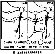 小题1:1950年至2000年.该地区城市发展变化的特征是________、________、________。一般说来,城市化水平不断提高的重要标志是________。