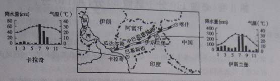 (1)气候特征主要表现在气温和降水两方面,根据图中卡拉奇和伊斯兰堡两地气温降水量图,可以得到两地气温、降水两方面的差异。