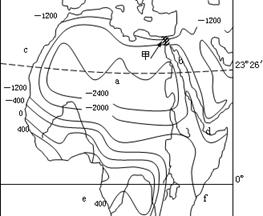 2、单选题 读世界某地区水平衡分布图(水平衡:年降水量减年蒸发量),完成1~2题: