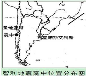 3、综合题 北京时间2010年2月27日14时34分在智利发生了8.8级的地震,震中位于35.8°S,72.7°W。(10分)