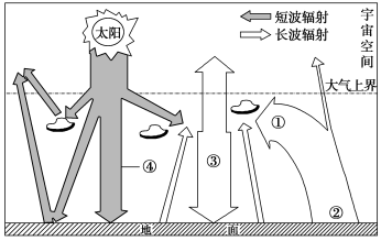 【小题1】根据图中信息可知,④来自太阳代表太阳辐射,③来自大气辐射并指向地面代表大气逆辐射,②来自地面代表地面辐射,①为大气吸收地面辐射;二氧化碳等温室气体含量增多,可以通过环节①,大量吸收地面长波辐射,而使大气增温,通过环节③大气逆辐射,使大气对地面保温作用增强,故选项C正确。