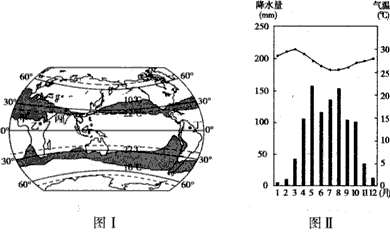 4、单选题 ? 图I为世界1月平均气温10℃~22℃范围示意图,图Ⅱ为某地年内各月气温变化曲线与降水量柱状图。读图回答1—2题。