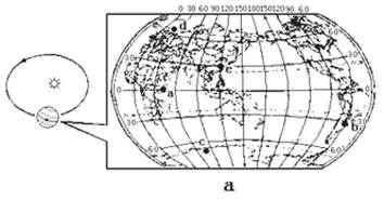 小题1:图a所示季节,一位俄罗斯专家在c地看到日落正西方,之后1小时下列各地发生的现象是