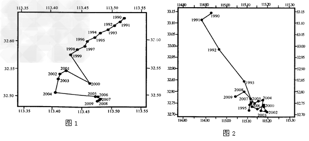 3、单选题  图1是1990年以来中国人口重心时空演变轨迹图,图2是1990年以来中国GDP重心时空演变轨迹图。广州地理位置(23.12°N,113.26°E),广东省人口数由1990年的6346万激增至2009年的9638万,是全国人口数增长最多、最快的省份。回答1~2题。?