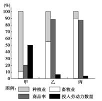 3.丙地区种植业比重很小,以畜牧业为主,商品率高,而且劳动力投入少,最可能是大牧场放牧业。建设高质量的人工草场,提高牧草质量是提高土地载畜量的合理措施。
