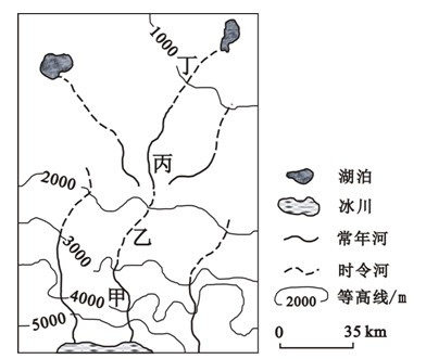 小题3:本题考查流域综合开发。该河的主要补给水源为冰川融水,流量小,河流流向为从甲流向丁。如果在乙地区大规模引水灌溉进行农业开发,导致下游地区水量减少,水资源的不合理利用将导致下游丙、丁地区出现荒漠化,所以选C项。