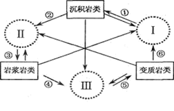 4、单选题 下图为岩石圈物质循环示意图,图中Ⅰ、Ⅱ、Ⅲ代表地质环境,箭头线代表地质过程。有关地质环境和过程的说法,正确的是