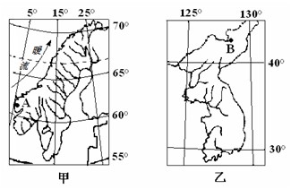 参考答案:(1)甲半岛纬度较高(跨温带和寒带),乙半岛纬度较低(位于温带);甲半岛位于大陆西岸(西临大西洋),乙半岛位于大陆东岸(东临太平洋)。