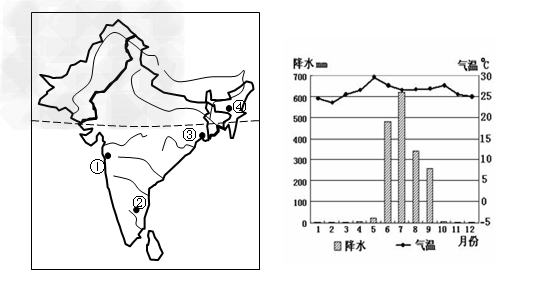 材料1 :下左图是南亚地区水系分布和主要国家轮廓简图,下右图是印度的气温降水图。