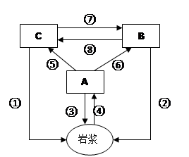 【小题1】根据岩浆,判断A为岩浆岩。故判断⑥⑦或为外力作用或为变质作用;⑤⑧或为外力作用,或为变质作用。