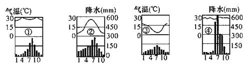 【小题2】根据图中等温线和降水柱状图判断可知,①为热带草原气候,②为亚热带季风气候,③为地中海气候,④为热带季风气候。根据地形剖面图中海陆分布状况,可判断该经线为20°E,该洲为非洲。非洲缺少热带季风气候和亚热带季风气候。