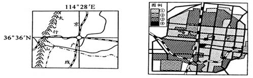 4、单选题 下图是邯郸市的位置和城市土地利用图,读图回答下列问题。
