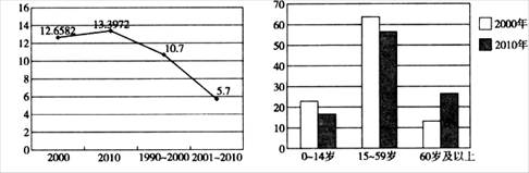 材料二?普查结果显示,2010年,我国男性人口占51.27%,女性人口占48.73%,总人口性别比由2000年人口普查的l06.74下降为105.20(以女性人口为l00.00);不同年龄段构成变化见上右图(单位:%)。