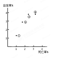 1、单选题 甲市2008年户籍人口出生9.67万人,出生率为0.699%;死亡10.7万人,死亡率为0.773%。甲户籍人口这种自然增长态势已持续14年。下图显示四个地区的人口出生率和死亡率,据此完成问题。