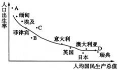 本题解析:第(1)题A点人口出生率最高,人均国民生产总值最低,应是坦桑尼亚;D点人口出生率低,人均国民生产总值最高,应是美国;B点人口出生率低,人均国民生产总值低,应是中国;那么C点应是巴西。第(2)题读图可知:发达国家人口出生率低,人均国民生产总值高;发展中国家人口出生率高,人均国民生产总值低。第(3)题曲线图说明人口出生率与人均国民生产总值关系,表明人口出生率高,人均国民生产总值就低,反之就高,这说明影响人口出生率的主要因素是经济因素。第(4)题中国人口出生率比其他发展中国家低,是因中国实行计划生育政策,控制人口生长。