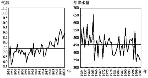 1、综合题 读我国山东地区1954—2002年气温与降水变化示意图,回答下列问题。(7分)