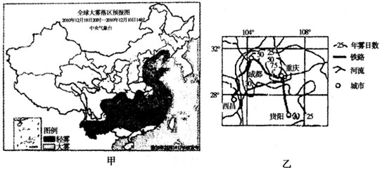 (2)假若你是中央电视台的天气预报员,请你根据材料二的甲图,向全国的亿万电视观众预报2010年12月18日—19日我国雾的分布地区。