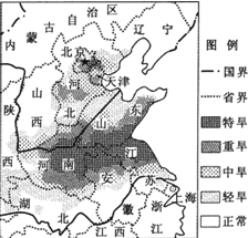 2、单选题 2010年10月~2011年2月我国华北大部及江淮北部等地区遭遇旱情。图为“2011年1月29日我国局部地区气象干旱分布示意图”。读图完成下列各题。