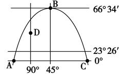 5、单选题 如图表示全球处在同一日期时,曲线 ABC上的太阳高度为0°,读图完成问题。