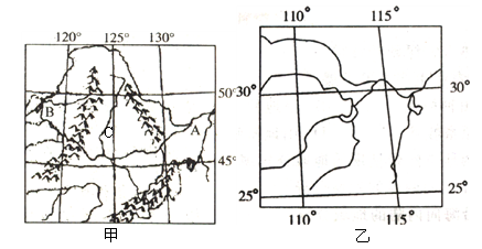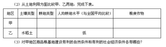 小题1:结合甲地区的经纬度位置和轮廓判断为我国东北地区;由于纬度高,热量不足,限制农业生产。根据乙地的经纬度位置判断为我国长江中下游平原。