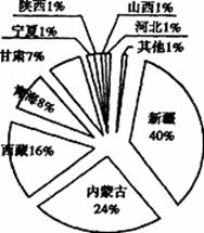 5、单选题 中国现有荒漠化土地267.4万平方千米,其中:风蚀荒漠化187.3万平方千米;土壤盐渍化 17.3万平方千米;冻融荒漠化36. 3万平方千米。图3—2—3为我国荒漠化土地主要分布示意图,图示的9个省区,占荒漠化土地总面积的99%。读图完成1~2题。