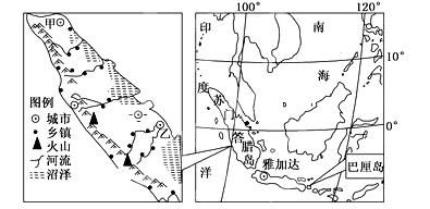(2)根据图中信息概括苏门答腊岛聚落的分布特点并简述其主要原因。(6分)