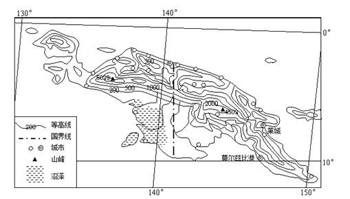 (1)地形就要指出主要地形类型及分布,地势特征是高低起伏的总趋势。根据材料一,结合材料二等高线图分析,该岛地形中部是高大山脉,呈西北—东南方向斜贯全岛。北部是海岸山脉,以丘陵、低山为主,沿海有面积狭窄的沿海平原。南部是平原,面积大,但沼泽广布。该岛的地势中部高,南北两侧低,山高坡陡,地势高差悬殊。
