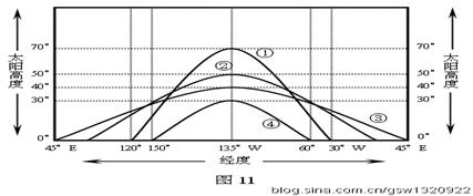 3、单选题 如图中①②③④四条曲线反映的是为日某时刻四条纬线上的太阳高度变化情况。读图回答问题。