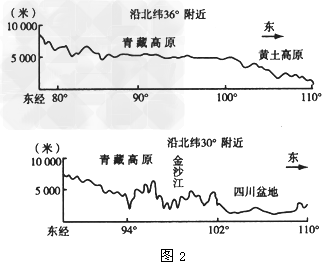 图1为青藏高原降水量分布图,图2为青藏高原地形剖面示意图。