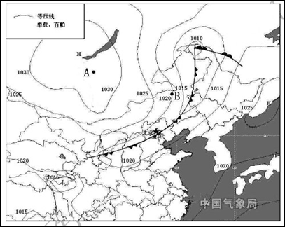 (3)此时,北京受下图中的 天气系统控制(填字母)受其影响,北京气温 (升高或降低),风力 (变大或减弱),阴晴状况为 (4分)