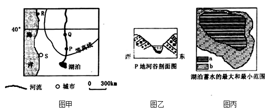 4、综合题 图甲为某区域示意图,图乙反映图甲中的P地河谷剖面,P地河谷剖面的形成和地转偏向力的作用有关。图丙反映图甲对应的湖泊情况。读图回答问题。(12分)