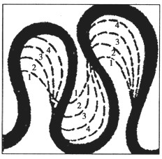 2、单选题 迂回扇是河漫滩表面形态,由一系列有规律地分布于凸岸边滩上的滨河床沙坝构成。沙坝向下游方向辐聚,向上游方向辐散。迂回扇是在河湾侧向蠕移过程中产生的。因侧向蠕移是脉动式而不是连续均匀地发生的,故当河湾侧蚀较慢时,凸岸边滩外缘的滨河床沙坝不断加高。当侧蚀加快后,凸岸边滩迅速淤长。若侧蚀再度减缓,则在凸岸边滩外缘新的位置上又会出现相对高起的滨河床沙坝。该过程反复进行,便形成了完整的迂回扇。读下图完成1~2题。