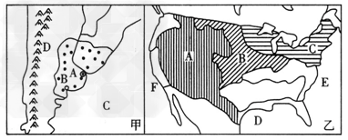 (2)乙图中B处的农业地域类型为__________,主要的农作物是______、________,该农业的主要特点:_______________,_____________。