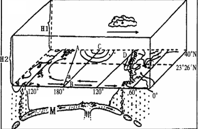 2、综合题 读下面地理景观模式示意图,AB表示昏线,H1和H2分别代表当地对流层的高度,此时南极圈以内全部出现极昼现象,回答后面问题。