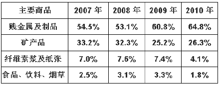 材料二:智利素称“铜之王国”,产量和出口量均为世界第一;它是拉美第一大林产品出口国和世界第五渔业大国。智利属于中等发展水平国家,是拉美增长最快的经济体之一。智利经济主要依赖对外贸易。下表为2007—2010 年智利对中国出口的产品结构(占对中国出口总量的比重)。