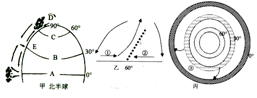 3、填空题 读甲、乙、丙三幅三圈环流完整或局部图,完成下列问题。(12分)