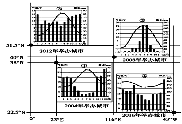 5、单选题 读四届奥运会举办城市的位置和气候资料图,回答下列各题。