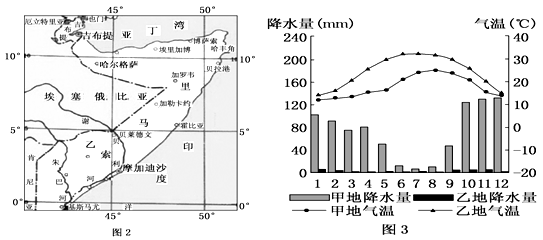 材料2:图1为地中海地区冬雨率等值线图(注:冬雨率为冬季降水量占全年降水量的百分率,单位:%),图2为“非洲之角”示意图,图3为甲、乙两地气温和降水统计图。